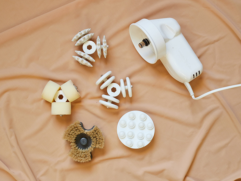 - Cabezal roll on: para aplicación de cremas. Formado por 12 bolitas roll-on que se encargan de aplicar de una manera profunda y uniforme la crema específica que corresponda al tratamiento elegido.
